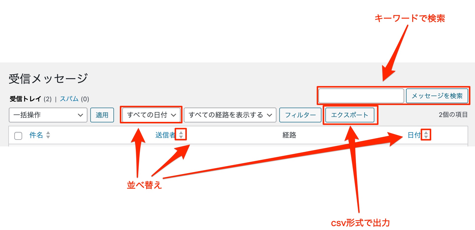 運営管理画面から【お問い合わせ】>【受信メッセージ加】をクリックするとお問い合わせの受信メッセージ一覧が表示されます。