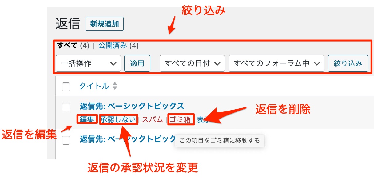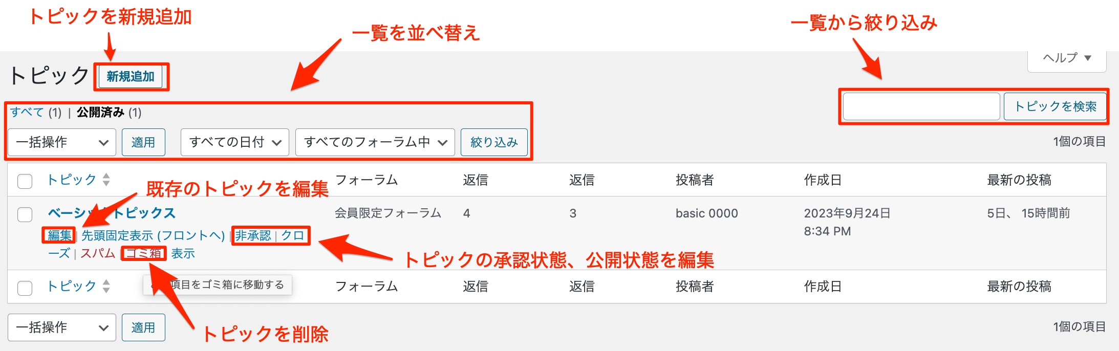 トピックではフォーラム内でテーマを絞り込んだ議題を用意し、その議題に対して会員がコメント(返信)することができます。